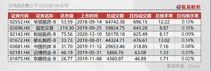 截至5月21日,已经有7家18A公司日均成交额低于1000万港币,更有2家公司日均成交额低于100万港币,流动性日渐枯竭。