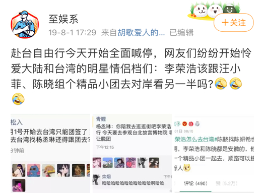 但两岸婚姻有时也受两岸关系影响,比如2019年8月初,赴台自由行被全面喊停。当时,网友们开始可怜大陆和台湾的明星情侣们,并调侃:李荣浩该跟汪小菲、陈晓组个精品小团去对岸看另一半吗?
