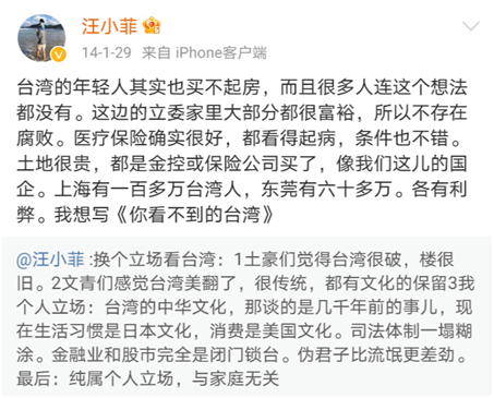 ·汪小菲2014年在微博客观探讨台湾和大陆的文化和生活差异。