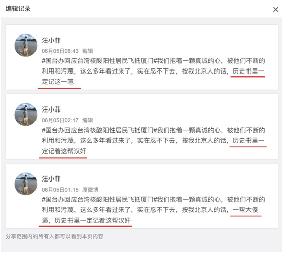 差不多同一时间,汪小菲还发文痛批,称确诊的台湾人跑去厦门的行为是“汉奸”。根据微博的编辑记录,他措辞前后改了3次,最终将“这帮汉奸”改为“这一笔”。