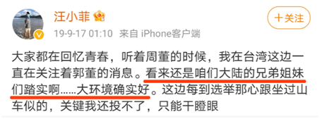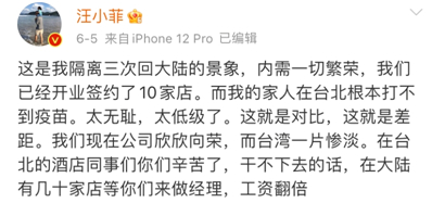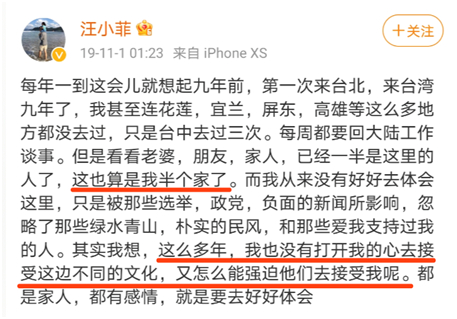 但很快就又“啪啪啪”打脸。2019年起,汪小菲又开始在微博抨击台湾,并且承认“我从来没有打开我的心去接受这边不同的文化”。