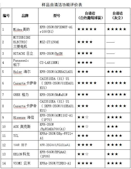 14款样机在购买时网页中均宣称具有自清洁功能,测试中发现11款可实现自清洁细菌和自清洁灰尘操作,而三菱电机、日立、松下3款样机在自清洁功能启动时室外机无法运转,不能产生冷凝水,不能实现利用冷凝水自清洁灰尘的功能。