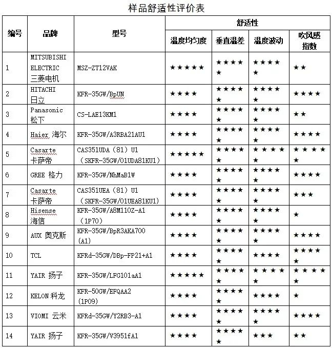 我们对除了“Midea美的”品牌以外的14款样机均进行了舒适性的测评,通过测试空调样机在一定空间内启动后,温度均匀度、垂直温差、温度波动和吹风感指数等四项数据来体现空调的舒适性。