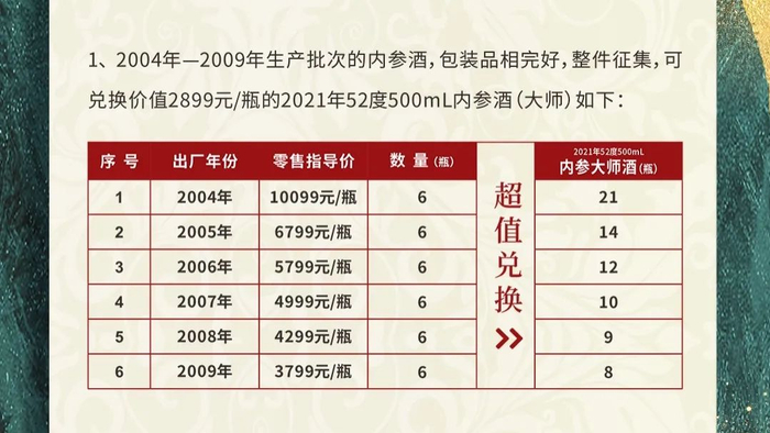 对于今年老酒征集活动的具体政策是,2004年-2009年生产批次的内参酒,包装品相完好,整件征集,可兑换价值2899元/瓶的2021年52度500ml内参大师酒,不同年份能够兑换的数量有所不同。另外,还可以按套征集,2004年-2009年生产批次的内参酒每年一瓶为一套,一套可兑换2021年52度500ml内参大师酒12瓶。