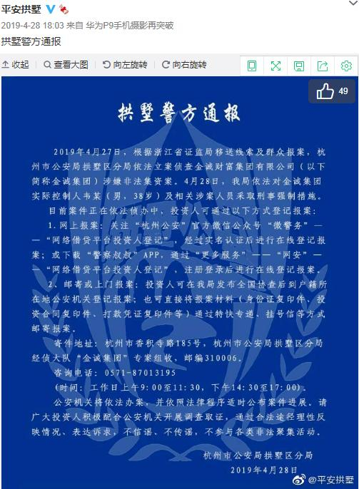 据平安拱墅官方微博当时发布的拱墅警方通报,2019年4月28日,浙江省杭州市公安局拱墅区分局依法对金诚集团实际控制人韦某(男,38岁)及相关涉案人员采取刑事强制措施。