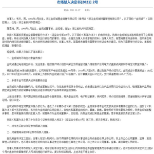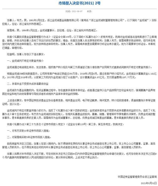 6月7日,浙江证监局发布市场禁入决定书,称因存在向不特定对象宣传推介、承诺本金不受损失或承诺最低收益等违法事实,对金观诚基金销售有限公司(曾用名“浙江金观诚财富管理有限公司”,以下简称“金观诚”)的实控人韦杰和董事长、总经理蒋雪琦分别采取10年与5年证券市场禁入措施。