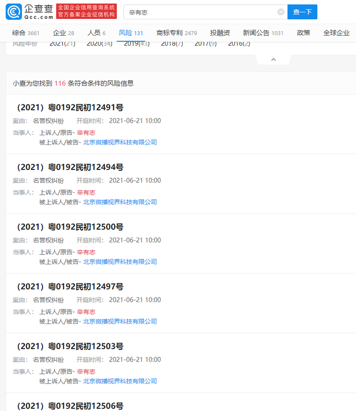 其中显示,此次案由涉及网络侵权责任纠纷、名誉权纠纷,审理法院为广州互联网法院,包含多起案件,将集中于2021 年6月21日开庭。