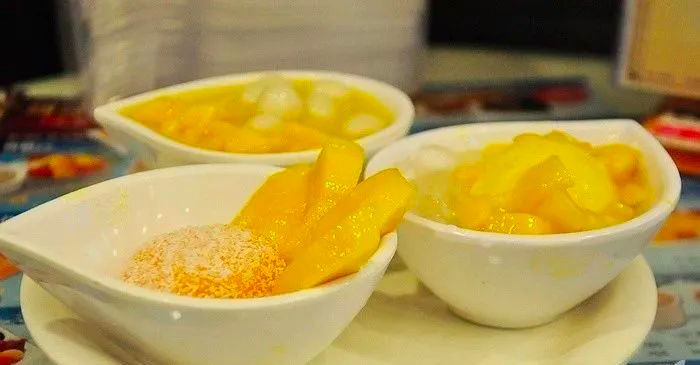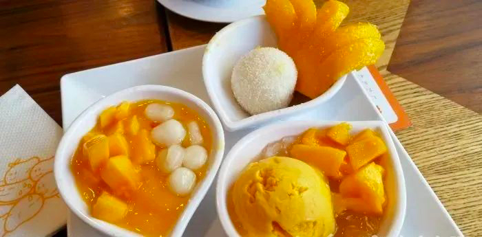 把传统港式糖水里的西米,加入芒果汁中,上头还要盖上半个新鲜芒果。