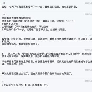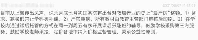 6月7日又有消息传出,不久将来会出台对教培行业史上最严厉的整顿,其中包括周末寒暑假禁止学科类补课、所有教材由教育主管审核后印刷,在学校内通过课后托管的方式在周一到周五有序开展课后兴趣班的辅导,鼓励学校老师承接。