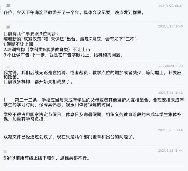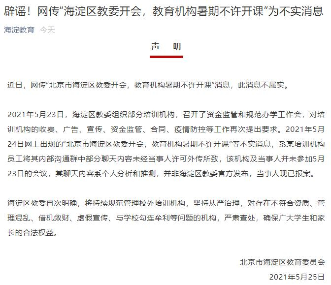 5月24日,一张截图在业内流传,其中提到的教育机构暑期不让上课已被海淀区教委辟谣,但不准投广告、不准上市,6岁以前所有线上线下培训都将被禁止的说法,还无定论。