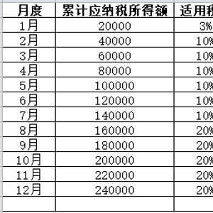 假设2020年您没有跳槽,全年在A公司工作,每月收入和扣除情况不变,您1月取得的工资薪金收入减去免税收入、减除费用、专项扣除、专项附加扣除、依法确定的其他扣除后的应纳税所得额为20000元。