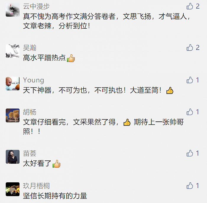 文章短短一个小时,阅读量就破万次,不少粉丝留言大赞基金经理文笔好,读完文章受益匪浅。一位粉丝留言称,“真不愧为高考作文满分答卷者,文思飞扬,才气逼人,文章老辣,分析到位!”