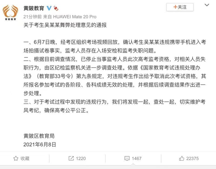8日中午,涉事考生所在区武汉市黄陂区教育局通报了关于考生舞弊的处理意见: