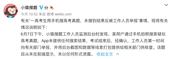 声明如下:6月7日下午,小猿搜题工作人员监测后台时发现,某用户通过手机拍照搜索疑似高考真题,App未提供任何搜索结果,考试结束后,经确认,工作人员第一时间向有关部门举报,并将后台截图和数据等线索打包提供给相关部门供核查。该题目从未在前端显示,未以任何形式泄露。