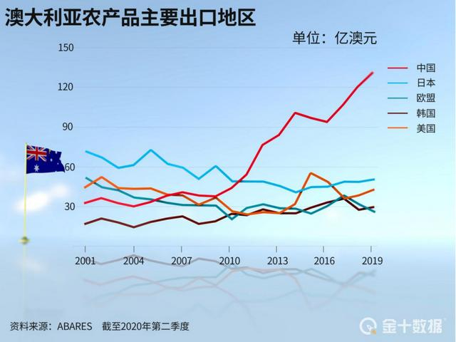 澳大利亚是全球主要的农业出口大国,其农产品出口中有三分之一(33%)远销中国。澳大利亚全国农民联合会(NFF)负责人托尼·马哈尔年初就算了一笔帐,中澳贸易趋冷,将导致当地农业在未来10年内损失369亿澳元(约合人民币1827亿元)。