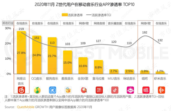 在Questmobile发布的《2020“Z世代”洞察报告》中,网易云音乐以27.8%的Z世代用户活跃渗透率位居移动音乐APP榜首,同时其Z世代用户活跃渗透率TGI高达219,同样位居移动音乐APP榜首。