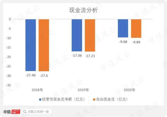现金流也是类似,2018-2020年,公司经营性现金流和自由现金流每年都是净流出,尽管每年的净流出金额在减少。