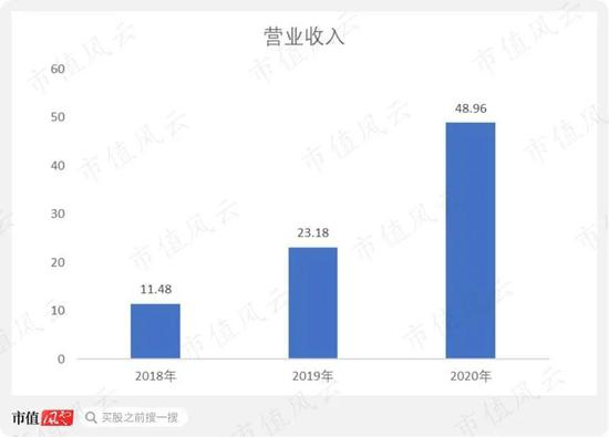 公司营业收入从2018年的11.48亿元增长至2020年的48.96亿元,年复合增速高达107%,营业收入基本是一年翻一倍。