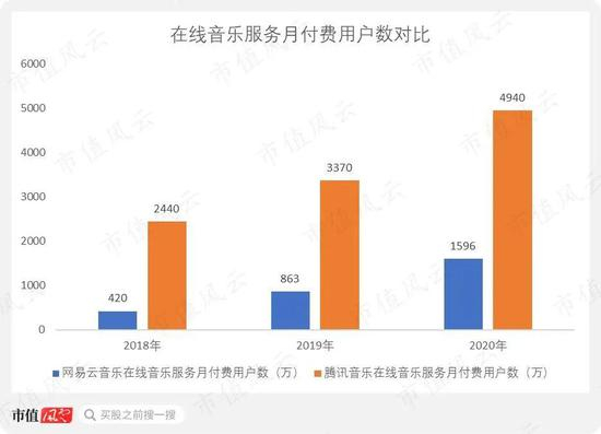 腾讯音乐在线音乐服务的月付费用户数从2018年的2440万增长至2020年的4940万,年复合增速为42%,不如网易云音乐的95%。