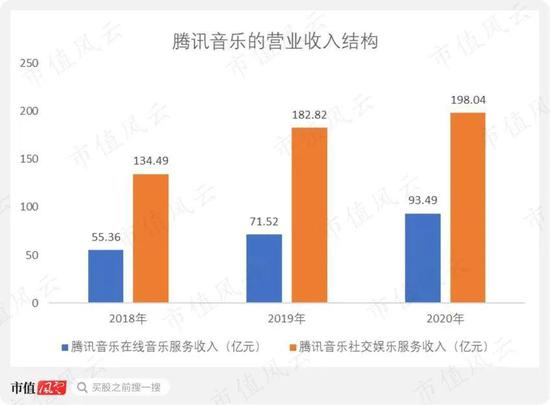 2018-2020年,腾讯音乐在线音乐服务收入从55.36亿元增长至93.49亿元,腾讯音乐社交娱乐服务收入从134.49亿元增长至198.04亿元。