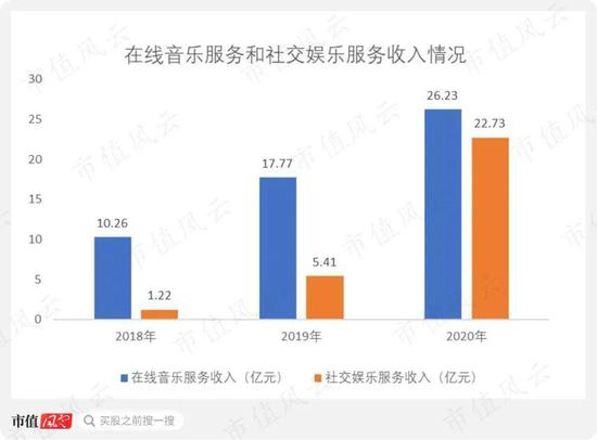 2018-2020年,公司在线音乐服务收入从10.26亿元增长至26.23亿元,社交娱乐服务收入从1.22亿元增长至22.73亿元,社交娱乐服务的收入增长明显快过在线音乐服务的收入增长。