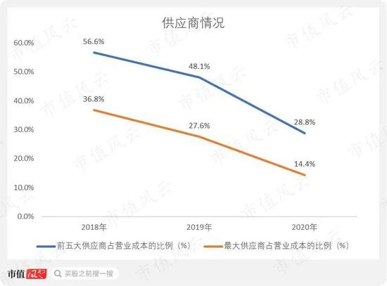2018-2020年,前五大供应商占公司营业成本的比例从56.6%下降至28.8%,最大供应商占营业成本的比例从36.8%下降至14.4%。