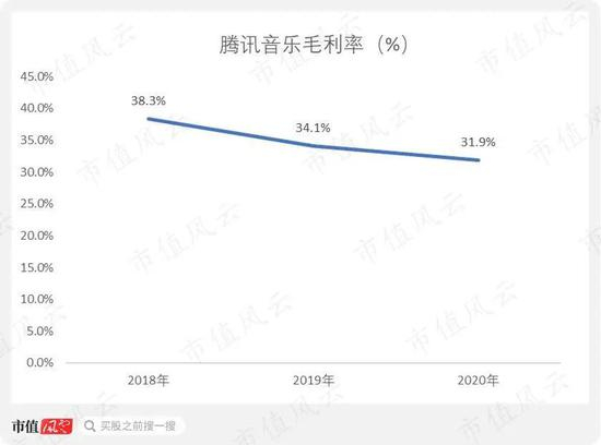 腾讯音乐的毛利率从2018年的38.3%下滑至2020年的31.9%,虽然毛利率在下降,但是依然保持在30%以上。