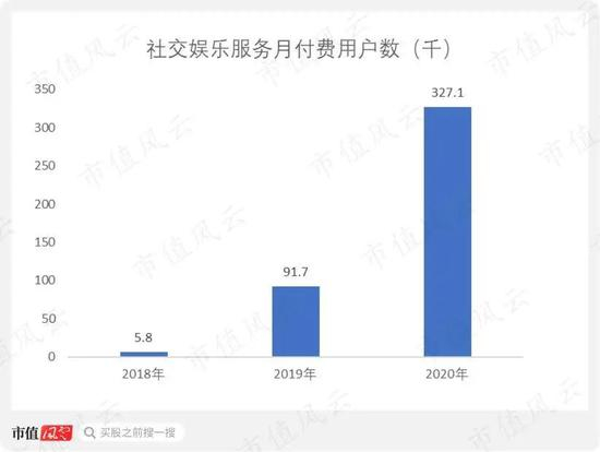 截至2020年年末,社交娱乐服务的月付费用户数只有32.71万,虽然规模小,但是增长速度非常高,年复合增速高达650%。
