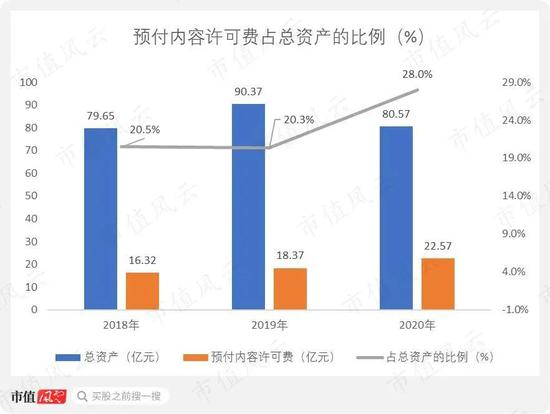 预付内容许可费从2018年的16.32亿元增长至2020年的22.57亿元,预付内容许可费占总资产的比例从2018年的20.5%增长至2020年的28%。
