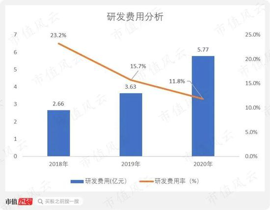 风云君最后说一下研发费用,研发费用是公司最大的费用性支出。研发费用从2018年的2.66亿元增长至2020年的5.77亿元。