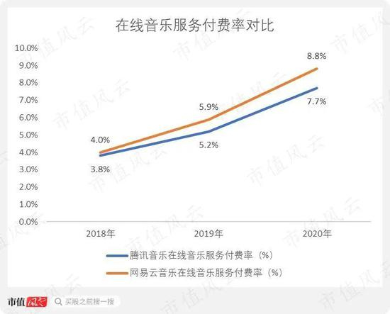网易云音乐的在线音乐服务付费率从2018年的4.0%上涨至2020年的8.8%,腾讯音乐的在线音乐服务付费率则从2018年的3.8%上涨至2020年的7.7%,虽然都是呈上涨趋势,但是网易云音乐的付费率明显上涨得更快。