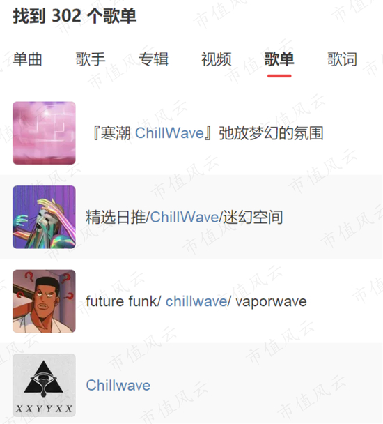 用户创建的歌单可以有多个主题,比如用作睡眠或者工作的歌单。也可以是某种音乐流派的集合歌单,比如风云君直接输入关键字“Chillwave”,平台上就会显示许多有关“Chillwave”这一音乐流派的歌单,歌单里的歌曲基本都是这一个类型。