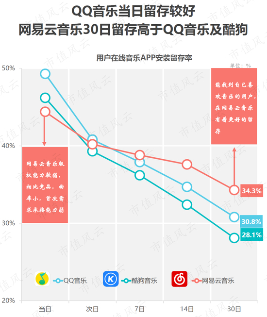 不过,对于那些已经选择留在某个平台的用户,网易云音乐的用户留存情况又明显好于竞争对手,简单说就是,如果你喜欢上了网易云音乐,那你大概率会一直喜欢网易云音乐。