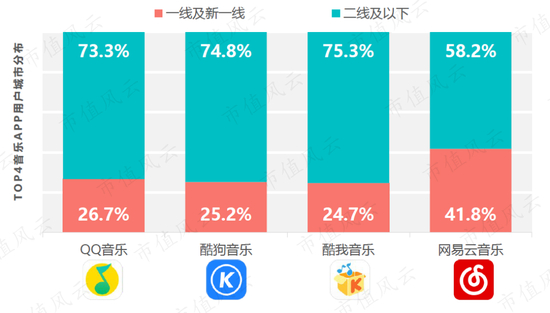 另据Fastdata的《2020年中国在线音乐行业报告》,QQ音乐、酷狗音乐以及酷我音乐这三款APP的用户下沉性特征非常明显,这三款APP的用户有70%以上是来自二线及以下的城市,而网易云音乐APP的用户有40%以上是来自一线及新一线城市。