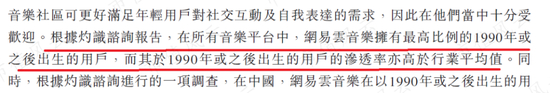 首先是年龄,公司在招股说明书中说,网易云音乐89%以上的用户都是90后,而且根据灼识咨询的报告,国内的所有在线音乐平台中,网易云音乐拥有最高比例的90后用户,而且公司对于90后的渗透率也是高于行业平均值的。