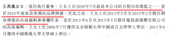 最后一位执行董事是王燕凤,她是公司的自制内容总监之一,之前曾在凤凰新媒体担任高级编辑,后来担任网易传媒的高级编辑和专栏作家,负责网易集团整体的品牌传播业务。
