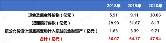 现金及现金等价物、短期银行存款以及按公允价值计量且其变动计入损益的金融资产,三者合计从2018年的36.07亿元增长至2019年的64.17亿元,后又下降至47.94亿元。