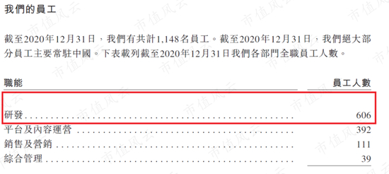 截至2020年年末,网易云音乐共有1148名员工,其中研发人员是最多的,有606名,占总员工人数的比例达到53%。