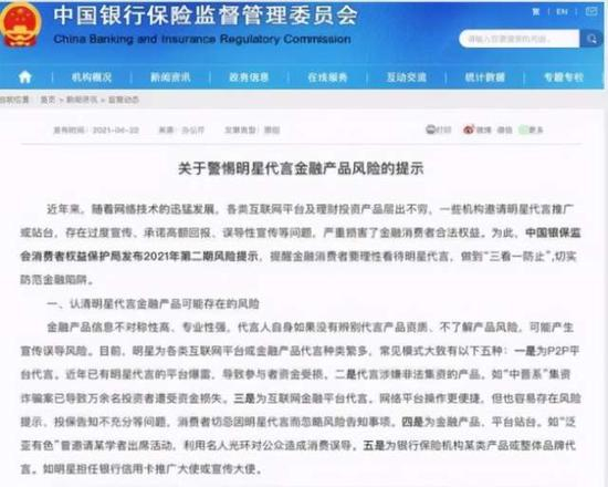 因此,银保监会也在此前发文提示明星代言乱象的风险,其中直指一些机构邀请明星代言推广或站台,存在过度宣传、承诺高额回报、误导性宣传等问题,严重损害了金融消费者合法权益。