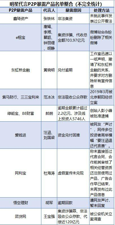 近年来,代言P2P理财产品的明星不计其数。据不完全统计,自2015年至今,明星代言P2P产品经历了较长时间的野蛮生长期,包括张铁林、黄晓明、范冰冰、郎朗、王宝强、汪涵、杜海涛、杨迪等近百位明星为此类产品代言或站台,且都曾因其代言的P2P平台事发而身陷舆论风波。