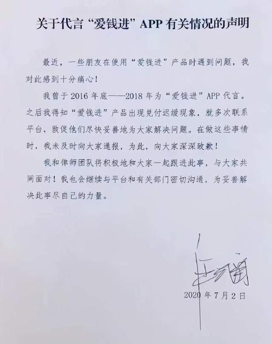 据悉,汪涵曾在2016年到2018年间作为“爱钱进”的代言人在线上线下对该产品进行了多次宣传,且有多位投资者表示自己是通过汪涵等明星的代言广告,出于信任才选择了该平台,要求汪涵等明星为此负责。最终,汪涵等人不得不对此发表道歉声明,并表示将敦促平台解决问题。