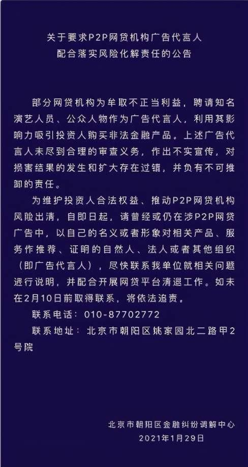 今年1月29日,北京朝阳区金融纠纷调解中心发布的一则公告,再次将P2P平台代言明星们推向舆论的风口。