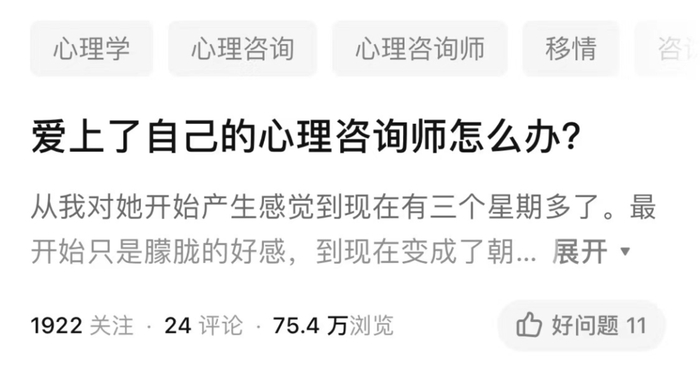 事实上,“爱”上自己的心理咨询师,不是一个罕见的事,知乎上关于这个话题的提问,已经得到了75.4万的浏览量。