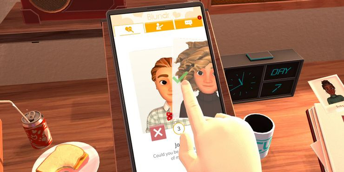 游戏中选择约会对象是通过一款名为“Blundr”的软件来决定,左滑拒绝、右滑喜欢,可选择与同性或异性约会,类似于现实生活中的约会软件“Tinder”。