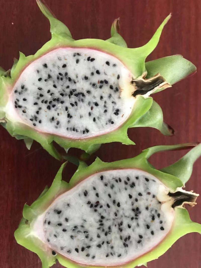 记者了解到,“绿龙果”的果子比普通火龙果略小,但甜度高达18度,果肉有一股荔枝的清香味,让原本火龙果的甜味中带上了一丝清新的口感。尤其值得一提的是,“绿龙果”的花非常漂亮:普通的火龙果花,萼片呈绿色或淡紫色、花瓣呈白色,而“绿龙果”的花萼片呈深红色、花瓣呈鲜红色,非常艳丽。