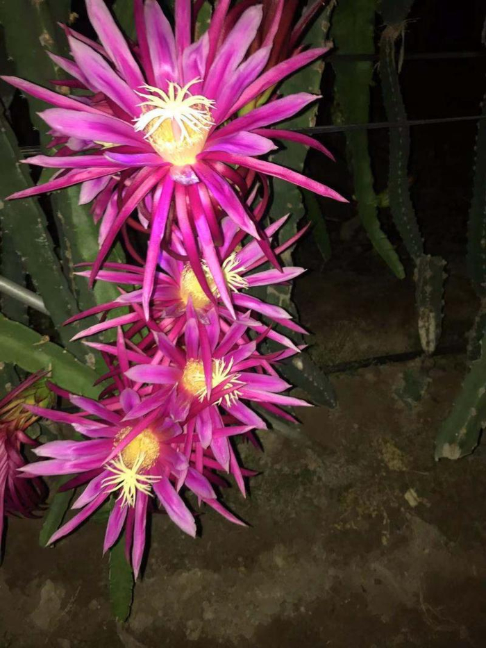 火龙果原产于沙漠地区,所以通常为夜间开花,次日受阳光照射就会慢慢闭合凋谢,常绽放于20点左右,凋谢于次日早上7点左右。“绿龙果”开花时,一片片舒展娇媚的红色花瓣包裹着嫩黄色的花蕊,丝丝缕缕的淡雅香气弥漫在空气中,可谓不是昙花却胜似昙花。