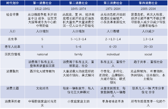 三浦展根据人口增速、出生率、老年人比率等角度对日本过去的160年消费社会划分为四个阶段,即:(1912-1941年)二战前少数中产阶级享受的第一消费社会;(1945—1974年)二战后以家庭为单位第二消费社会;(1975—2004年)石油危机后注重个人的第三消费社会;(2005—2034年)总人口开始减少老龄化严重的第四消费社会;这对于老龄化下的中国也有借鉴意义。