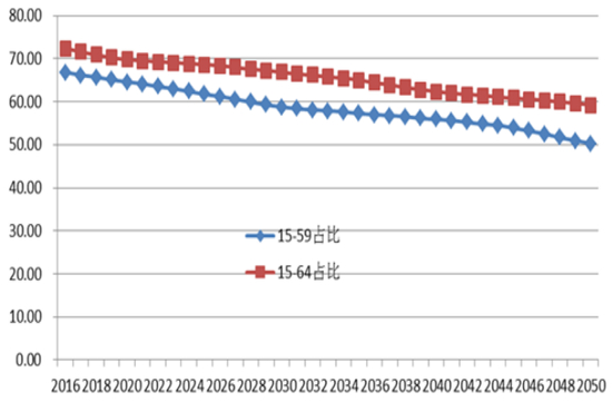 劳动年龄人口总量和占比持续下降:到2050年15-59岁人口为6.6亿,占比为50.24%;15-64 岁人口为7.78亿,占比为 59.22%。