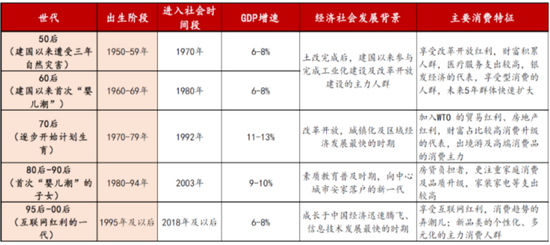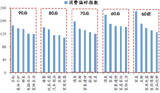 不同世代消费偏好存在差异,如80后偏好母婴、汽车,60和70后偏好酒类,60前偏好医药保健等,因此人口年龄结构变化对不同行业影响各异。