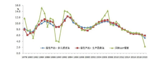 实际增长率、潜在增长率完全吻合且呈下降趋势。
